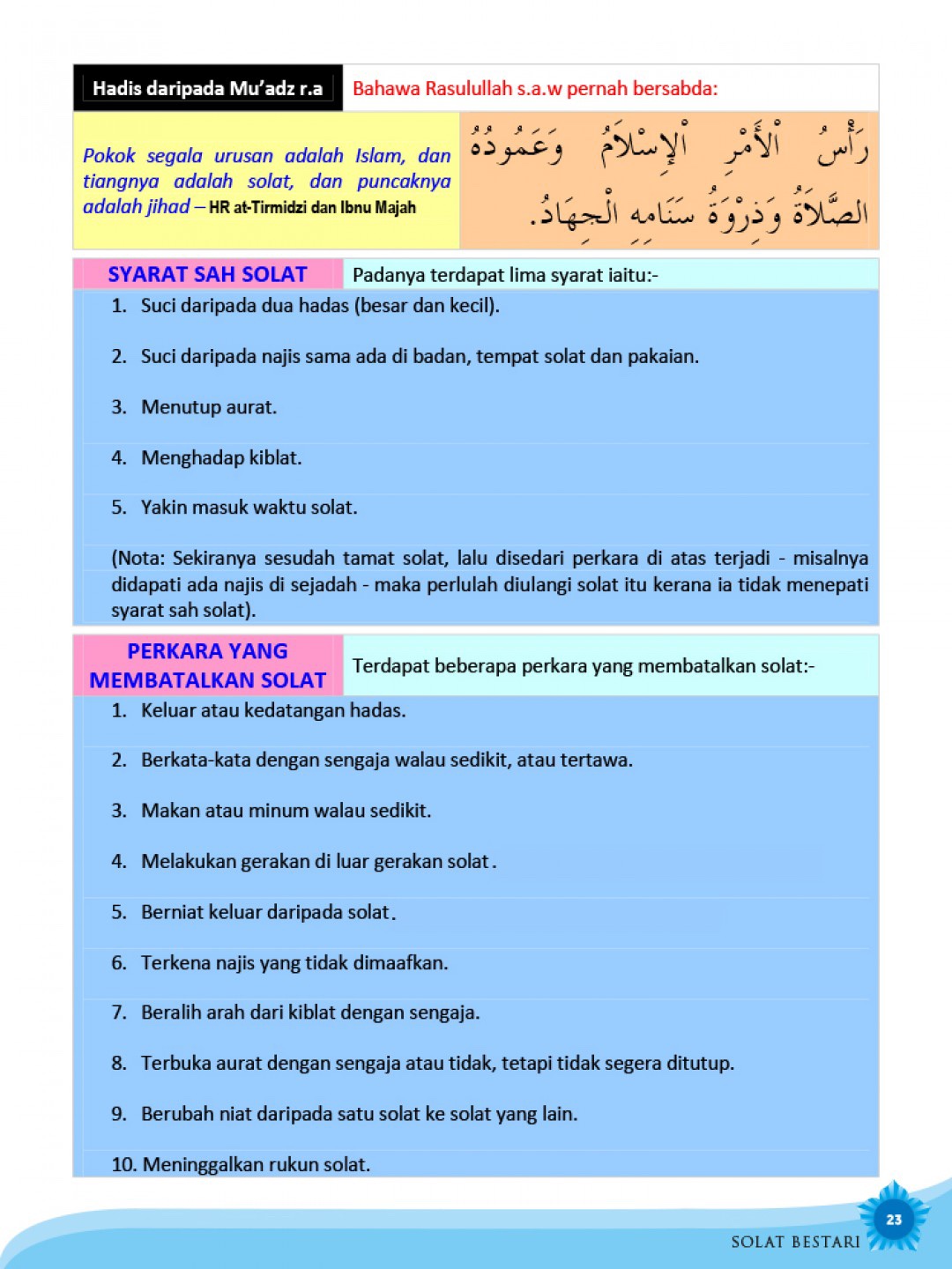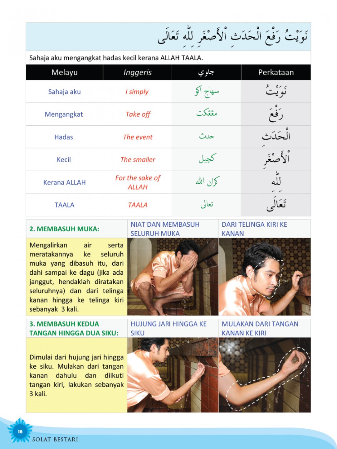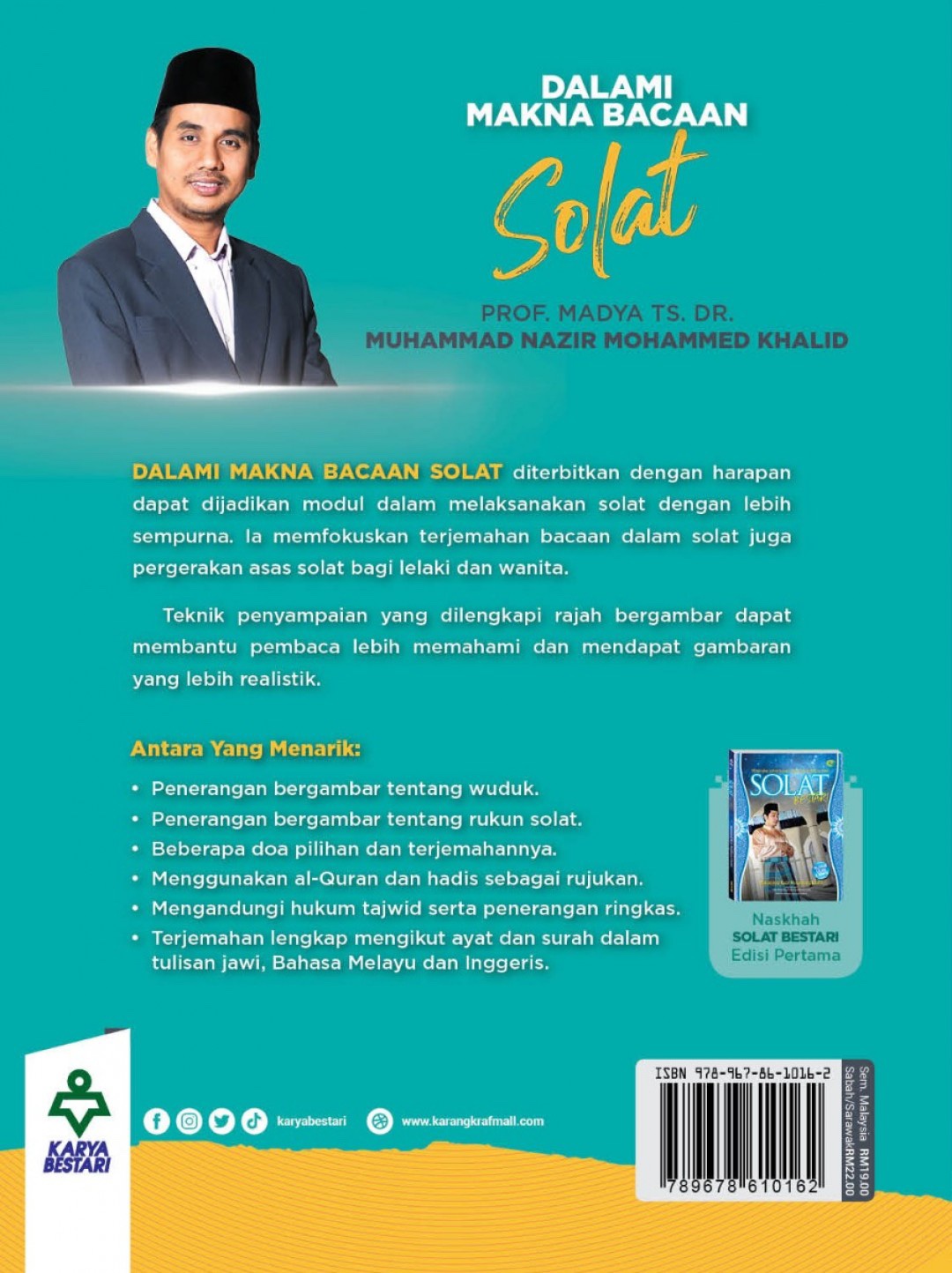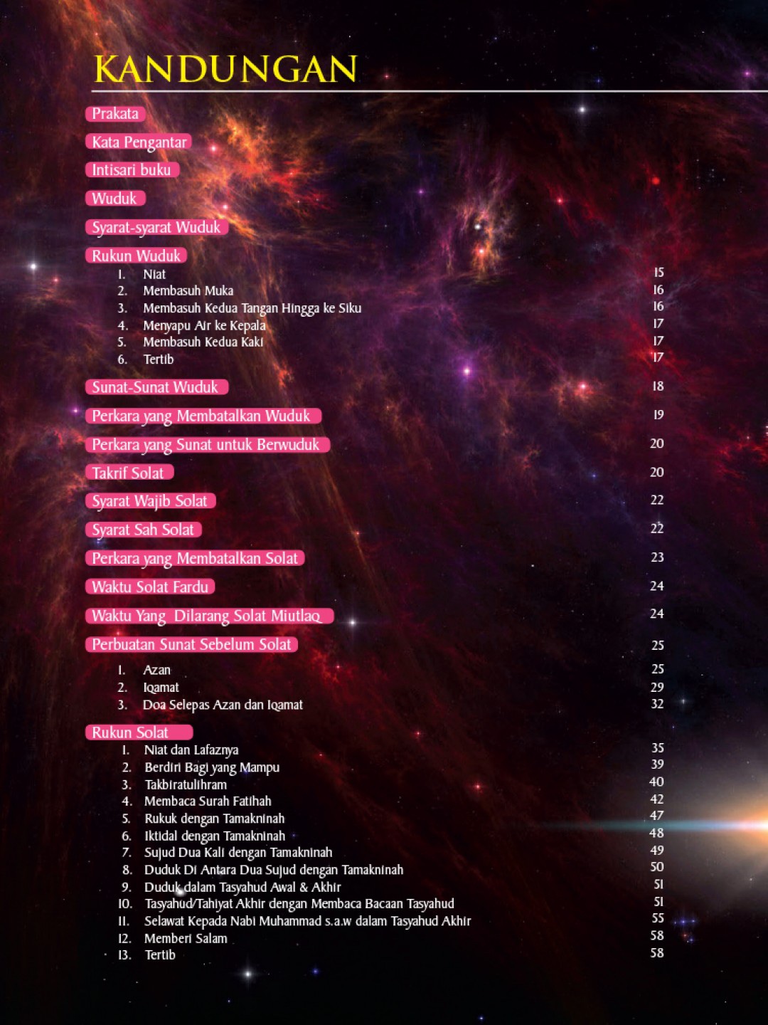Buku ini diterbitkan dengan harapan dapat dijadikan modul dalam melaksanakan solat dengan lebih sempurna. Ia memfokuskan terjemahan bacaan dalam solat juga pergerakan asas solat bagi lelaki dan wanita.