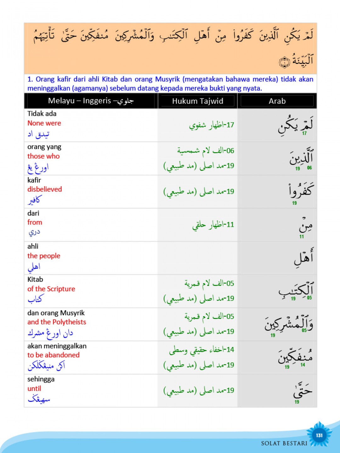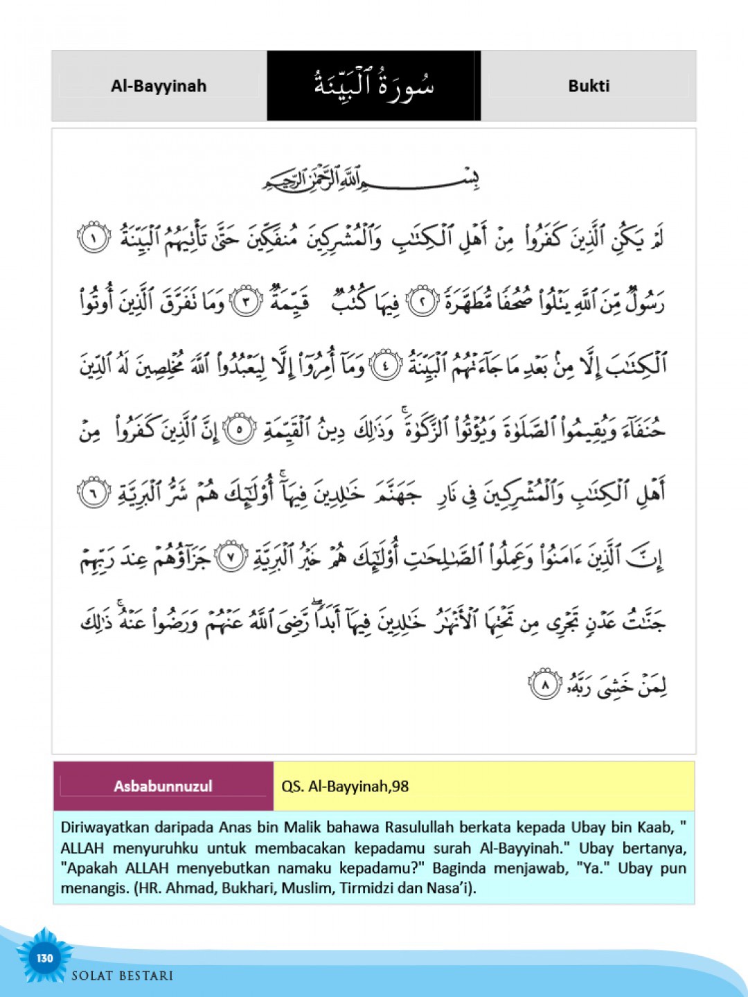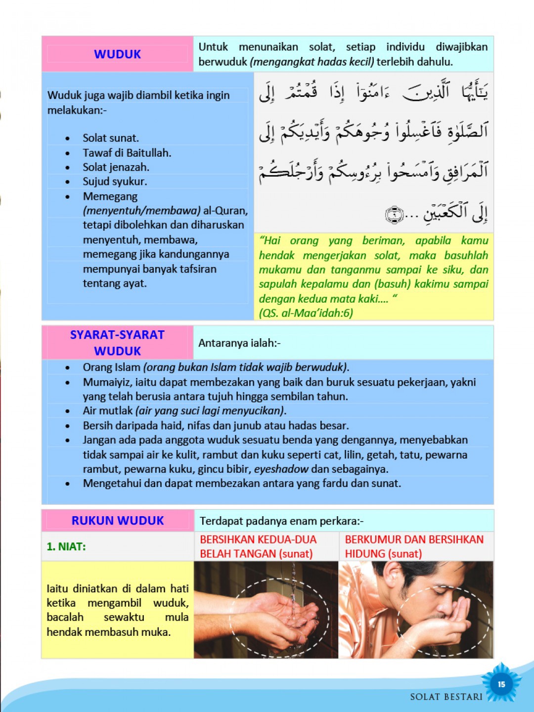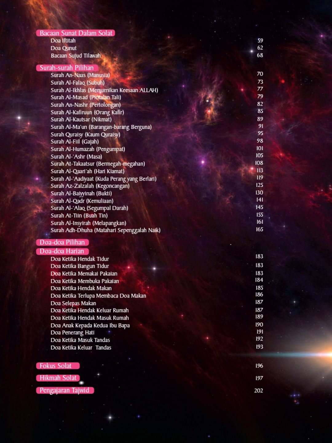 Buku ini diterbitkan dengan harapan dapat dijadikan modul dalam melaksanakan solat dengan lebih sempurna. Ia memfokuskan terjemahan bacaan dalam solat juga pergerakan asas solat bagi lelaki dan wanita.